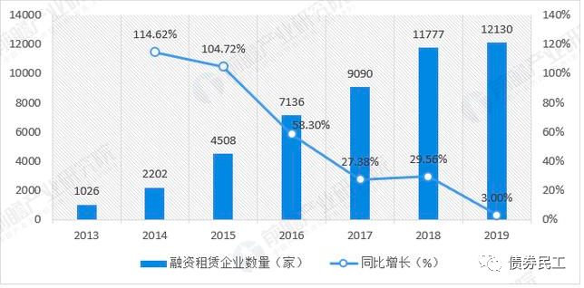 根據租賃聯合研發中心會同中國租賃聯盟、天津濱海融資租賃研究院組織編寫的《2019中國租賃業發展報告》,2019年中國融資租賃企業(不含單一項目公司、分公司、SPV公司、港澳臺當地租賃企業和收購海外的企業)總數約為 12130家,較上年增加了353家,增幅約為3%。從增幅數據可以看出,融資租賃行業的數量幾乎是呈現斷崖式下跌。而最新的截至2020年6月底,全國融資租賃企業總數約為12151家,較上年底增加了21家,增幅只有 0.17%。