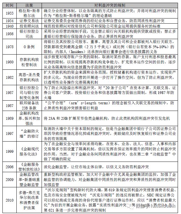 美國為了防止利益沖突而制定和執行的法律,主要集中在金融防火墻的制度設計上,但是基于業務的不同,形成了同質性和異質性兩種不同的利益沖突規制路徑,“前者(的利益沖突防范機制)主要是針對同質性金融機構或其關聯企業設立的,如多功能證券商與銀行集團等,(而)后者主要是針對異質性金融機構的,如由銀行公司、證券公司及保險公司等機構所形成的金融企業集團。”對于金融中介利益沖突的法律規制,在相關法律的不斷修訂中逐漸形成一個有機的整體: