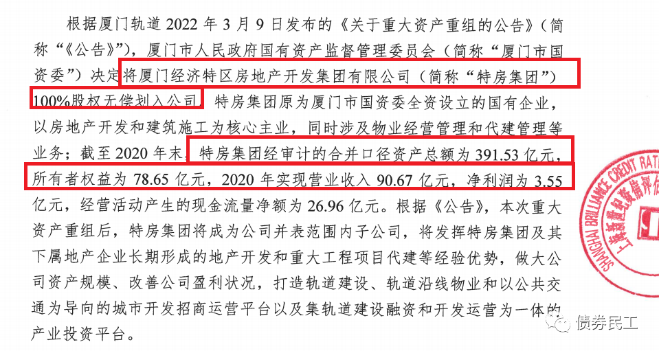 根據(jù)上海新世紀(jì)評級2022年3月14日披露的《關(guān)于廈門軌道交通集團有限公司重大資產(chǎn)重組的關(guān)注公告》。廈門經(jīng)濟特區(qū)房地產(chǎn)開發(fā)集團有限公司(以下簡稱“廈門特房集團”)劃入廈門軌道交通集團有限公司(以下簡稱“廈門軌道集團”),本次資產(chǎn)劃入事項構(gòu)成重大資產(chǎn)重組。