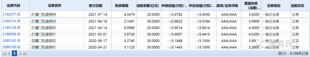 廈門軌道集團的主體信用等級為AAA(上海新世紀(jì)),目前存量債券有6只,存量債券金額為160億元,均為企業(yè)債券。