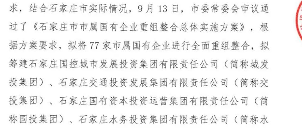 (1)2021年9月22日,石家莊國控投資集團有限責(zé)任公司披露了更名及資產(chǎn)劃轉(zhuǎn)的公告,石家莊市擬將77家市屬國企進行全面重組整合,籌建石家莊國控集團、石家莊旅投集團、石家莊國投集團、石家莊交通投集團、石家莊水投集團五大集團。其中石家莊國控涉及的劃出部分與主責(zé)主業(yè)非緊密聯(lián)系型企業(yè)或資產(chǎn),將突出集團主業(yè)的企業(yè)和資產(chǎn)劃入。本次資產(chǎn)劃轉(zhuǎn)涉及的資產(chǎn)規(guī)模變動超過500億元,可謂是城投公司整合的大手筆。