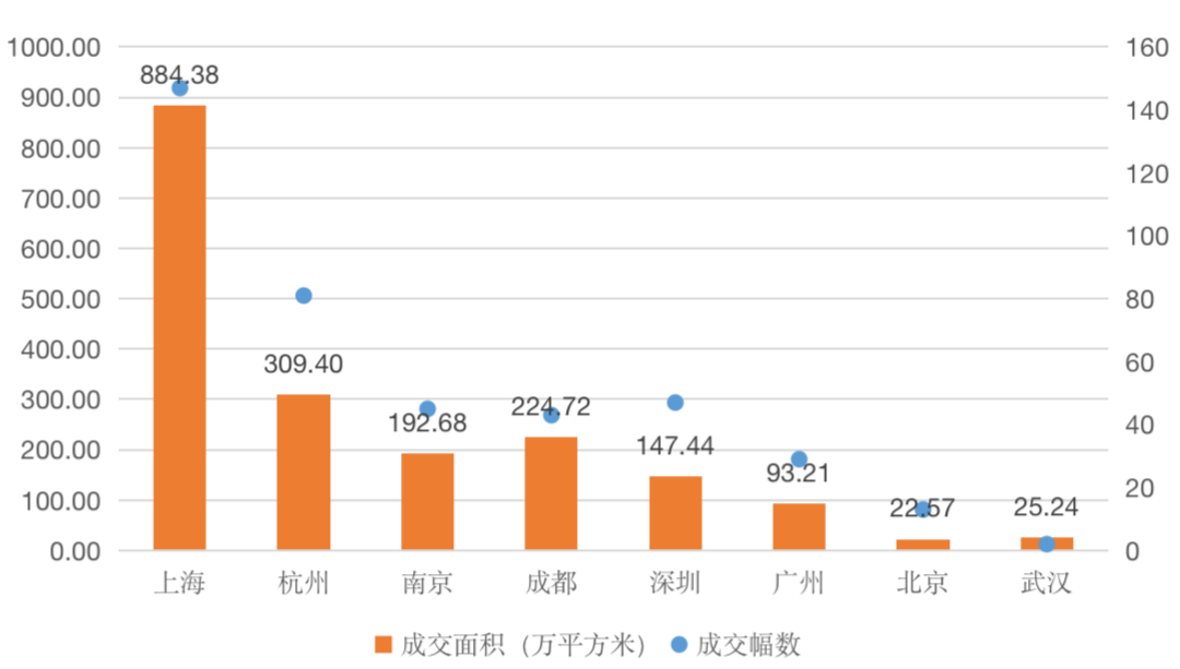 從成交情況來看,10月,重點22城中武漢、上海、杭州、北京、長沙五個城市完成第二批次集中供地,共成交租賃土地62幅,以拿地配建方式為主,總建筑面積累計約113.25萬方,值得一提的是,上海10月出讓租賃用地宗數(shù)和建面居五城之首,共成交租賃用地26宗,成交建面55.56萬平方米。克而瑞租售重點監(jiān)測的核心8城中,上海、杭州、北京、武漢4城成交租賃地塊58幅。