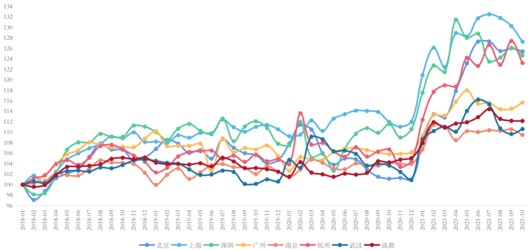 聚焦重點8城,以2018年1月為基期,核心8城租賃價格指數(shù)出現(xiàn)下降。截至2021年10月,8城市租賃價格指數(shù)區(qū)間仍然位于97.09-132.5,城市間差異較大。其中,上海租賃市場的發(fā)展的持續(xù)性和穩(wěn)定性最好。受租金調(diào)控影響,北上深杭四城租賃指數(shù)均呈現(xiàn)不同程度的下跌趨勢,而廣州租賃市場近期表現(xiàn)較差,已跌出第一梯隊。