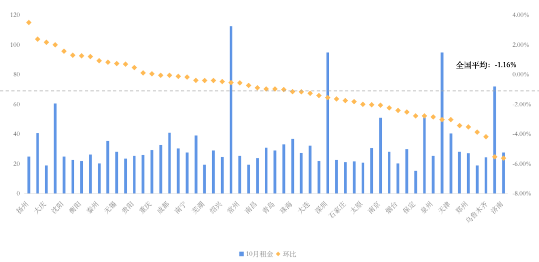 55城個人房源量價齊跌。具體數(shù)據(jù)來看,10月,55城個人房源租金為33.32元/平米/月,同比去年上升8.53%,較上月環(huán)比下降1.16%。從城市來看,10月租金環(huán)比下降的城市多達40個,超七成城市租金下降,杭州和濟南環(huán)比降幅最大,均超5%。