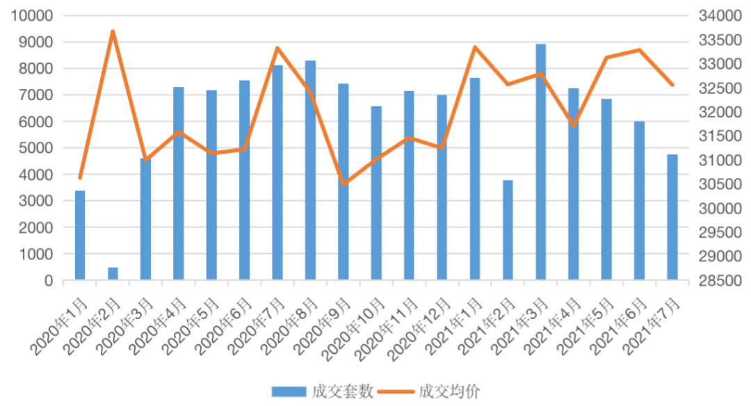 圖:2021年1月-2021年7月杭州二手住宅成交量價(單位:套、元/平方米)