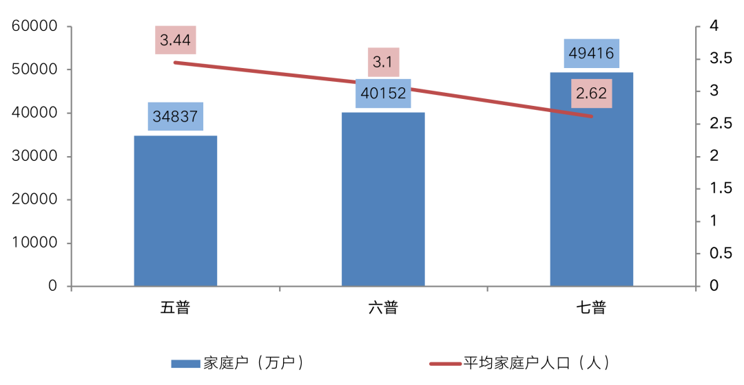 作為購房需求基本單位的家庭戶,共有49416萬戶,集體戶2853萬戶,平均每個家庭戶的人口為2.62人,比2010年的3.10人減少0.48人。
