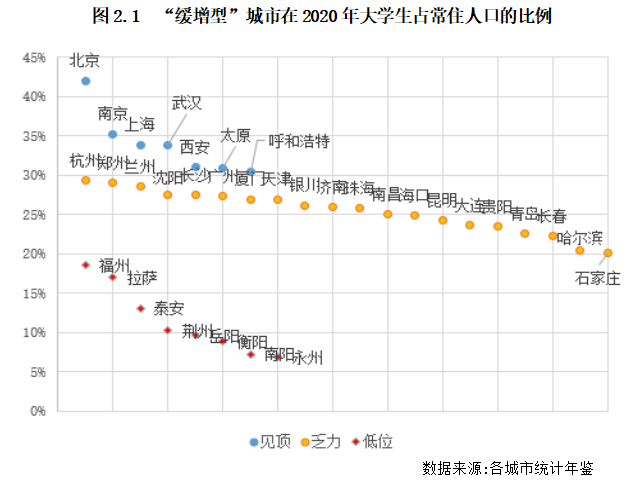 1)“高位見頂”型:大學(xué)生占比超過30%的城市,包括北京、南京、上海、武漢、西安、太原及呼和浩特等7個城市。
