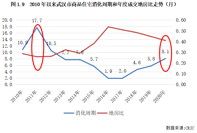 以武漢為例具體來看。2011年底,武漢商品住宅消化周期高達17.7個月,較上一年大幅增長,但同年武漢的地房比較上一年出現(xiàn)下降趨勢,拿地成本較上一年降低,而接下來武漢的庫存壓力逐步減輕,至2015年底消化周期已不足6個月,市場迎來新一輪的大漲機會。2020年時亦是如此,年初受疫情影響武漢市場熱度降至冰點,上半年庫存量也明顯增加,土地市場熱度亦降至低位,拿地成本降低,但隨著下半年市場逐漸恢復(fù),成交熱度上揚,房價也逐步走高,住宅周轉(zhuǎn)速度也明顯加快。因此,對于這類城市,逆周期布局可迎來更大收益,可重點關(guān)注這類機會。