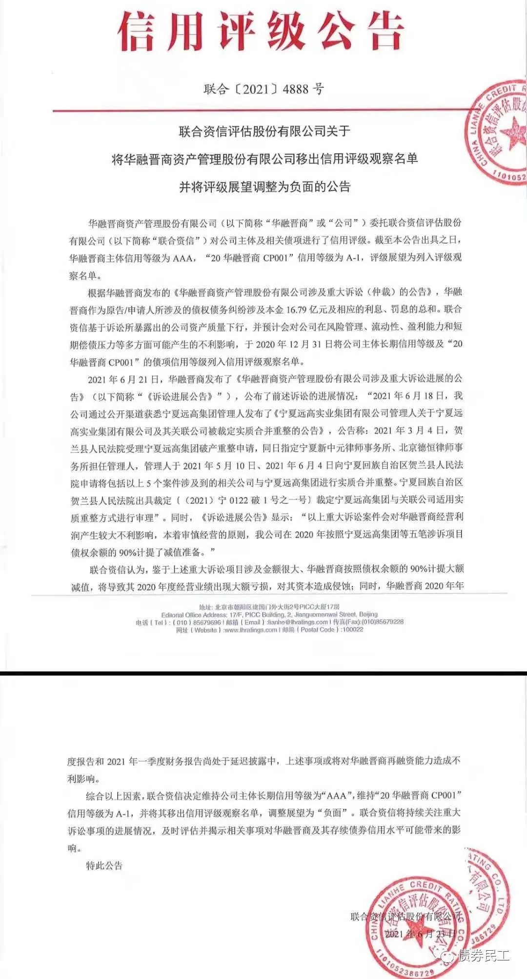 根據聯合資信2021年6月23日出具的評級報告,華融晉商資產管理股份有限公司的評級展望調整為負面!此次調整的主要原因是公司涉及16.79億元的重大訴訟。根據華融晉商2021年6月21日的公告,寧夏遠高集團已經開被裁定實質合并重整,公司在2020年對寧夏遠高集團等5筆訴訟債權按照債權余額的90%計提了減值準備。
