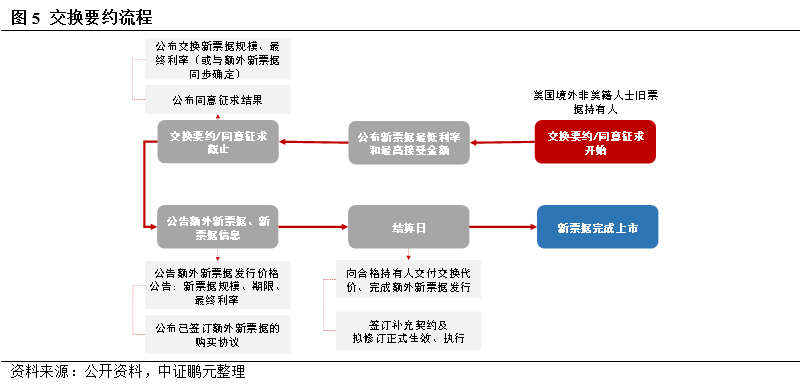 境內外制度差異:(1)境外市場中,交換標的債券更多元化,可以是單個未償還債券,也可以是多個有相同要素的票據。(2)新票據可包括額外新票據,與“交換新票據”構成單一系列,擁有相同的債券基本要素,用來支持同步進行的收購要約、對現有債務進行再融資、或用于日常經營。(3)交換要約限定性條件更多元,包括接納金額限制、同意征集限制等。(4)交換對價更多元,交換對價除新票據外,一般還會有部分現金和應計利息,以及同意費。(5)新票據利率和規模的確定,因是否同步發行額外新票據而有所差異。(6)相關事項的披露更加完善,首次公告中將披露交換要約背景、舊票據基本情況、交換代價、交換要約生效條件、交換票據利率和規模確定方式,時間表等。同步進行同意征求和發行額外新票據的,還將披露同意費用、同意生效條件、新票據發行必要性及資金用途、上市地點、信用評級等。(7)明確困境債務重組將下調主體級別,并持續動態追蹤。