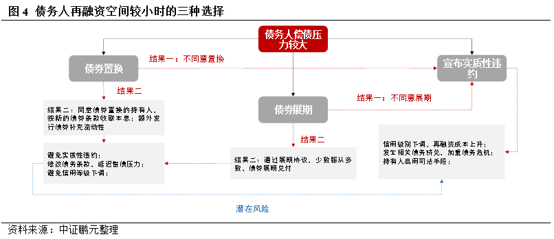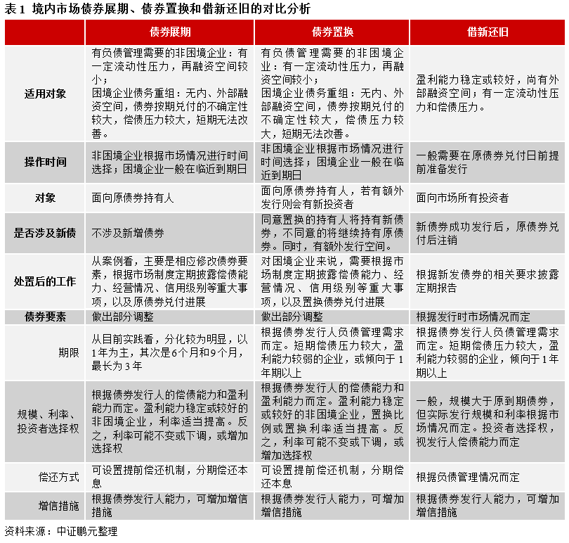 債券置換和展期,均面向原債券持有人,償付壓力延后,借新還舊則面向全市場投資者。債券展期、債券置換與借新還舊有不同的適用背景、操作流程和結果。整體看,僅僅是短期流動性出現問題,造成短期償債壓力增加的企業,適合借新還舊,尤其是市場利率走低的時期。而債券展期或債券置換適合外部融資空間有限、需進行負債結構調整的企業,其中無內、外部融資空間,經營情況欠佳,債務規模較大,短償債能力無法明顯改善的困境企業[1]可能會出現困境置換或展期,即展期或置換條款對持有人利益帶來實質性削弱。