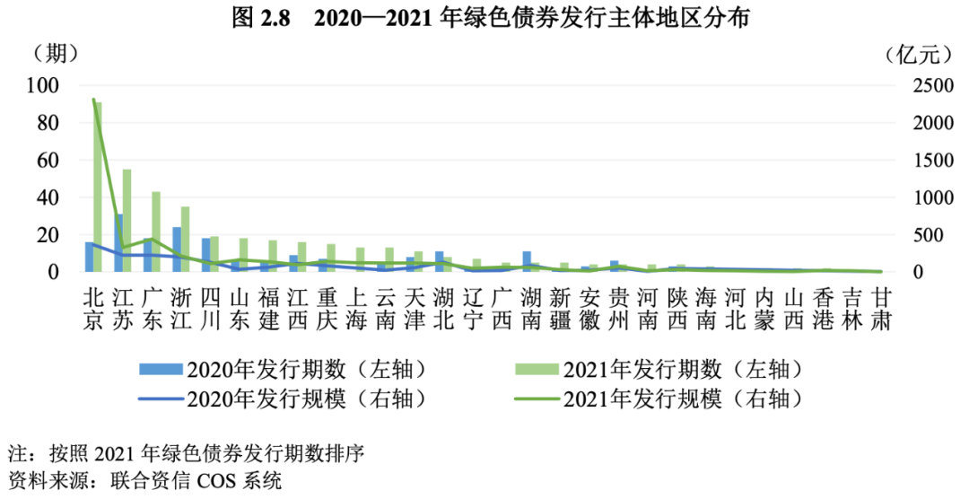 支持地方綠色債券發行。一是地方政府落實《關于加快建立健全綠色低碳循環發展經濟體系的指導意見》,支持地方綠色債券發行。為落實國務院發布的《關于加快建立健全綠色低碳循環發展經濟體系的指導意見》,2021年全國各省市人民政府相繼發布實施意見或方案(詳見附表1),鼓勵綠色債券的發行和投資,有助于進一步拓寬各地綠色企業的融資渠道,推動地方綠色債券的發行。二是地方政府實質性激勵增多,對地方發債企業給與財政支持。2021年南寧市、甘肅省、深圳市、寧夏自治區和廈門市等省市相繼出臺激勵政策,對成功發行綠色債券的當地企業給予發行獎勵,地方政府實質性激勵明顯增多,有助于降低地方發債企業的融資成本,切實推動地方企業綠色債券的發行。三是地方政府推動不同領域綠色債券發行。2021年青島市、北京市、上海市、陜西省、湖南省等省市政府或金融監管機構相繼發布政策支持綠色建筑項目運營企業、創新性綠色技術企業、綠色低碳企業、中長期綠色產業項目投資運營企業、中小綠色企業等不同領域和類型的企業發行綠色債券融資,有助于拓寬不同領域發行人的融資渠道,推動相關企業綠色債券的發行。四是地方政府支持綠色債券創新品種發行。2021年浙江省、深圳市、江蘇省等省市地區相繼發布政策鼓勵碳中和債、氣候債券、藍色債券、可持續發展掛鉤債券等創新綠色金融產品的發行,推動地方綠色債券市場進一步擴容。