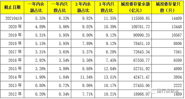 2、截至2021年4月19日,1年內(nèi)和3年內(nèi)城投債存量余額占比分別為5.35%和9.82%,且從整體趨勢(shì)上看,城投債的期限有縮短傾向。