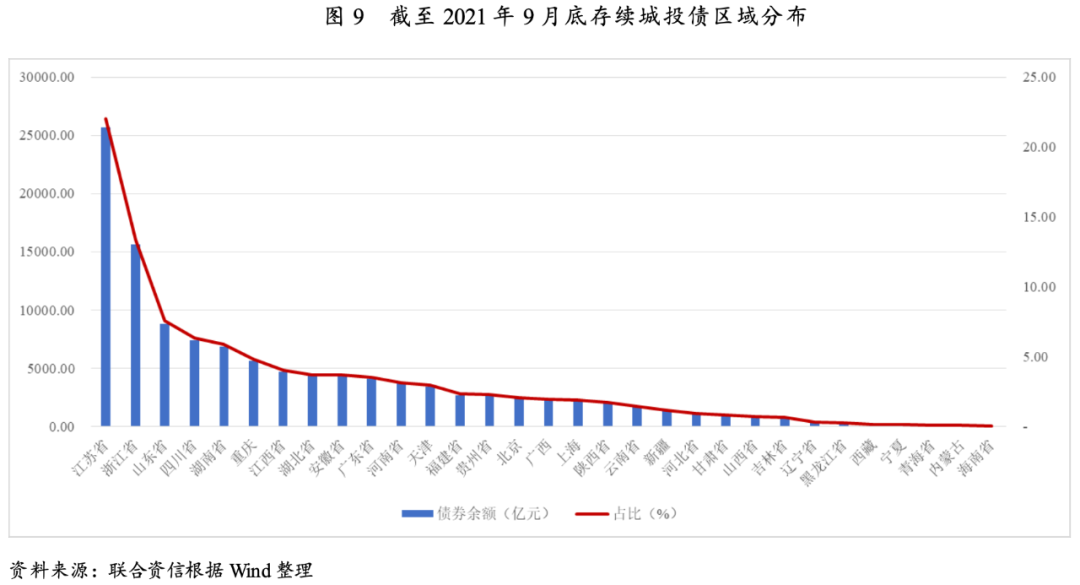 從區域分布看,江蘇省城投債余額仍居首位;從信用級別看,存續城投債以AAA級和 AA+級為主;從債券品種看,存續城投債以公司債和中期票據為主。