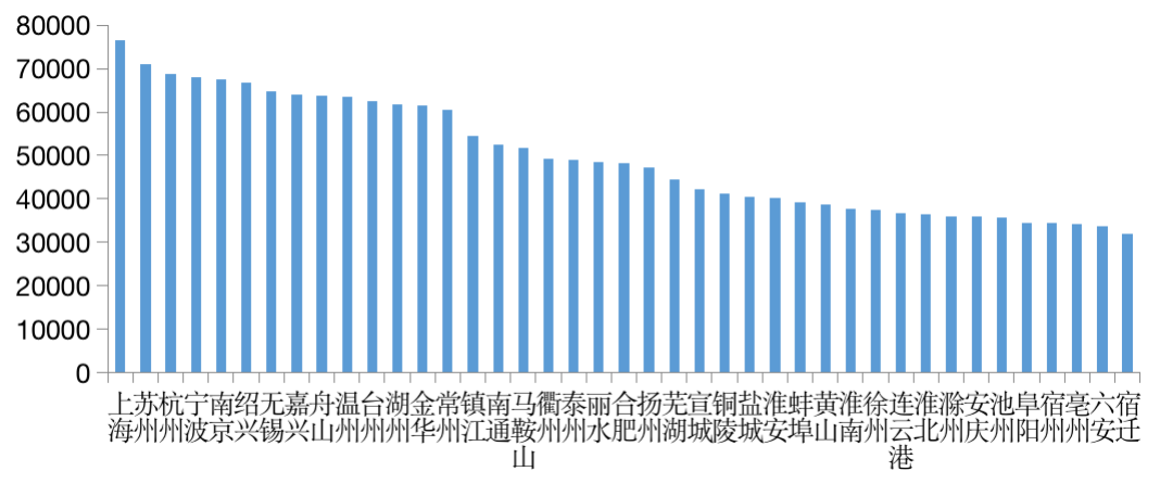 圖:長三角三省一市41城市2020年城鎮居民人均可支配收入(元/人)