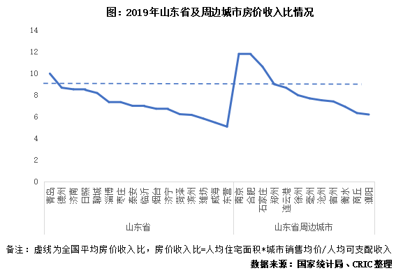 省內城市除青島外,房價收入比均低于全國平均,居民購房壓力小。從房價收入比來看,省內只有青島一城房價收入比達9.99,高于全國平均。其余城市房價收入比較低,居民購房壓力小。即便是省會城市濟南,購房壓力遠不及周邊省會城市南京、合肥和石家莊,甚至低于連云港這樣的三四線城市。