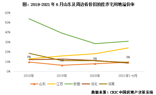 溢價率低于周邊省份,土拍市場相對平靜。據CRIC監測,2018至2021年6月,山東省涉宅招拍掛用地的溢價率維持在6%-9%之間,與周邊省份相比,處于較為健康水平。2021年,在雙集中供地新政下,濟南和青島兩市在5月完成了首批集中供地的出讓,市場熱度較低,分別有63%和98%的土地以底價出讓,其中青島的平均溢價率僅2%。