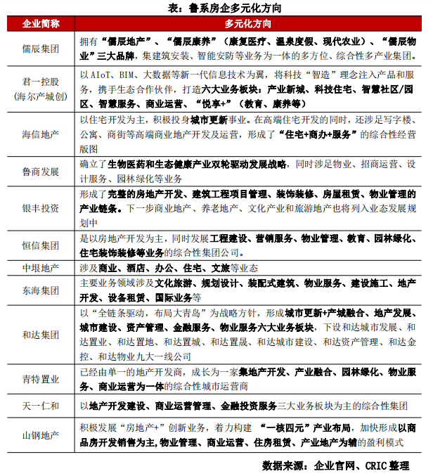 12家企業明確多元化方向,涉及范圍廣。從17家重點監測的魯系房企來看,共有12家明確了多元戰略,其中多數本身為企業集團,地產部分只是集團多元化板塊之一。比如,除地產開發外,儒辰集團還擁有康養、物業兩大板塊,此外還有建筑安裝和智能安防等綜合業務。君一控股(海爾產城創)、魯商發展、銀豐投資、恒信集團等作為企業集團,也至少擁有3個多元業務方向,值得一提的是,為完善地產開發上下游產業鏈,多數企業涉及了物業管理、裝飾設計等“地產+”業務。然而,也有房企涉足的部分多元業務與地產開發領域關系不大,比如魯商發展涉及化妝品和藥品生產銷售、恒信集團發展教育業務、和達集團把資產管理和金融服務納入主要業務板塊。