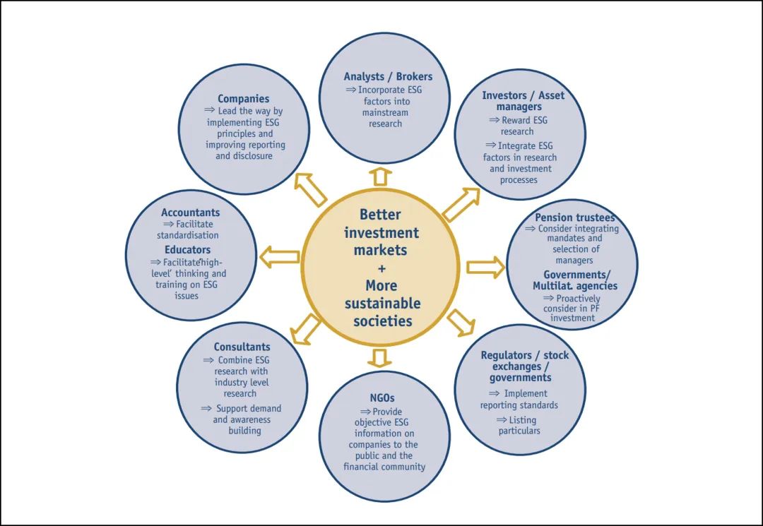 ESG是時(shí)代價(jià)值和市場(chǎng)之間的一座橋。2004年,時(shí)任聯(lián)合國(guó)秘書長(zhǎng)的科菲·安南,給全球55家大型金融機(jī)構(gòu)的CEO們寫了一封信。在信中,安南發(fā)起了一項(xiàng)宏偉的倡議:就如何在資產(chǎn)管理、證券經(jīng)紀(jì)服務(wù)及投資研究中融入環(huán)境、社會(huì)及公司治理(ESG)因素,建立全球合作并制定一套指南。該倡議名為“Who Cares Wins”。最初,該倡議只得到了9個(gè)國(guó)家、20家金融機(jī)構(gòu)的支持。從2004年至2008年,倡議支持者們每年都會(huì)舉辦一場(chǎng)會(huì)議,并發(fā)布年度研究報(bào)告。為提高各自角色的清晰度,支持者們針對(duì)不同類型的市場(chǎng)參與者,提出了相應(yīng)的ESG工作建議。實(shí)際上,這些身份和角色各異的市場(chǎng)參與者,共同組成了如今的ESG生態(tài)圈。圖片來(lái)源:UN GC,Who Cares Wins:Connecting Financial Markets to a Changing World