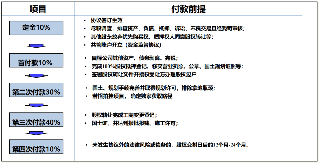 在收并購(gòu)項(xiàng)目中,一般會(huì)將對(duì)價(jià)分多批次支付,通過(guò)共管+解付條件控制每一筆資金支出。所謂不見(jiàn)兔子不撒鷹,每一筆款項(xiàng)支付必須結(jié)合關(guān)鍵節(jié)點(diǎn)+得到對(duì)等的權(quán)益。如涉及到需要我方先付的情況,則必須要求對(duì)方足額擔(dān)保。