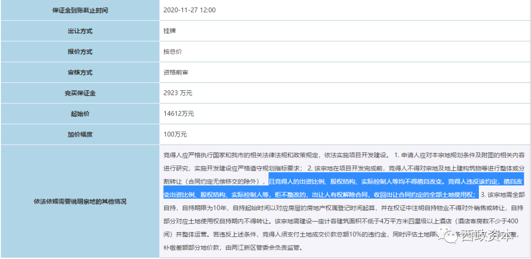 根據(jù)上述土地競拍方的資金需全部為自有資金的要求,監(jiān)管部門為了有效打擊開發(fā)商高杠桿融資拿地或倒賣土地的行為,目前有不少城市都已在招拍掛文件中對項目公司競得土地后的股權(quán)變更做出明確的限制性規(guī)定。以下為重慶市和紹興市土地出讓的相關(guān)限制性要求示例: