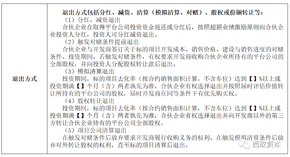 7. 退出方式:分紅、減資退出;觸發(fā)模擬清算退出;轉(zhuǎn)讓平臺公司股權(quán)退出;觸發(fā)對賭條件退出;項目公司實際清算退出。