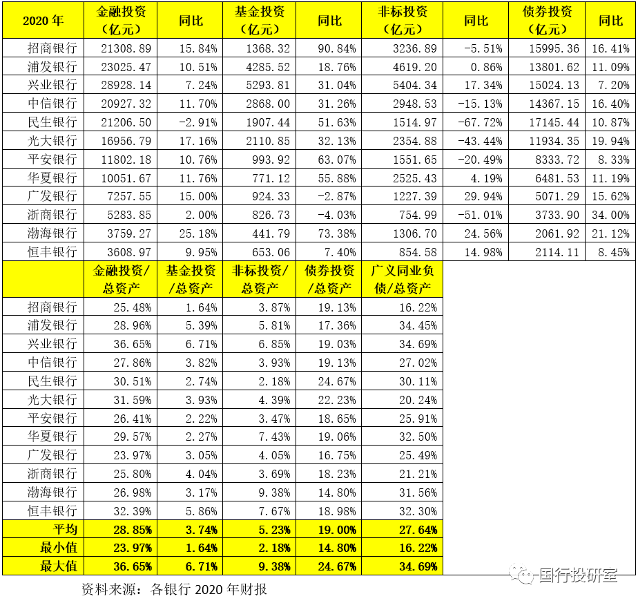 特別是從增速上看,2020年民生銀行、浙商銀行、光大銀行、平安銀行、中信銀行、招商銀行等均在壓降非標(biāo)投資規(guī)模,尤以民生銀行與光大銀行最為明顯。而對于債券投資和基金投資而言,股份行普遍加大了配置力度,這表明金融投資的內(nèi)部結(jié)構(gòu)調(diào)整是股份行正在做的事情。