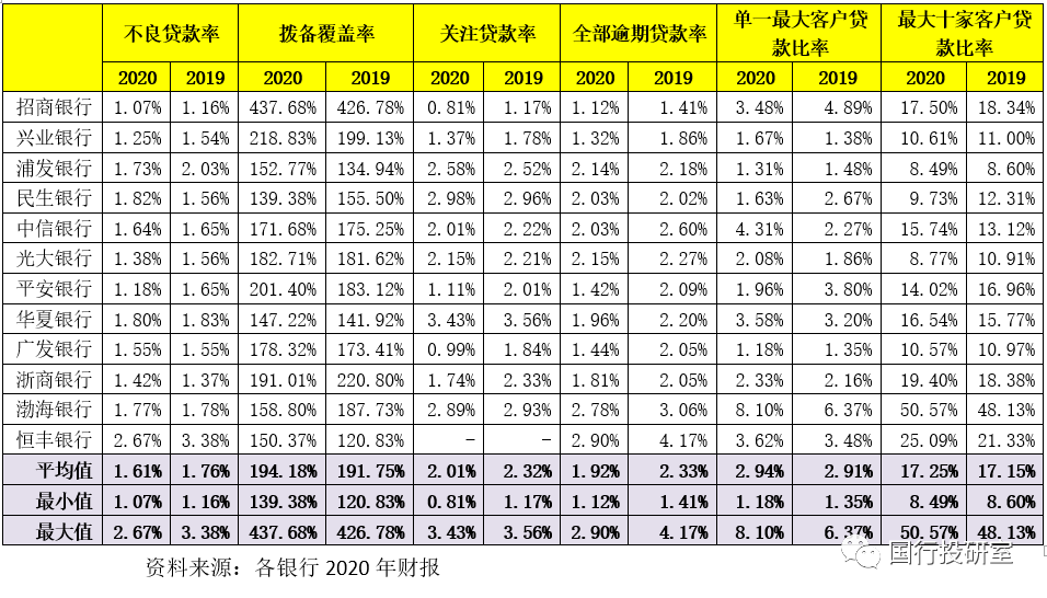 截至2020年底,12家股份行的不良貸款率、撥備覆蓋率、關(guān)注貸款率和逾期貸款率平均分別為1.61%、194.18%、2.01%和1.92%,較2019年均有明顯改善。