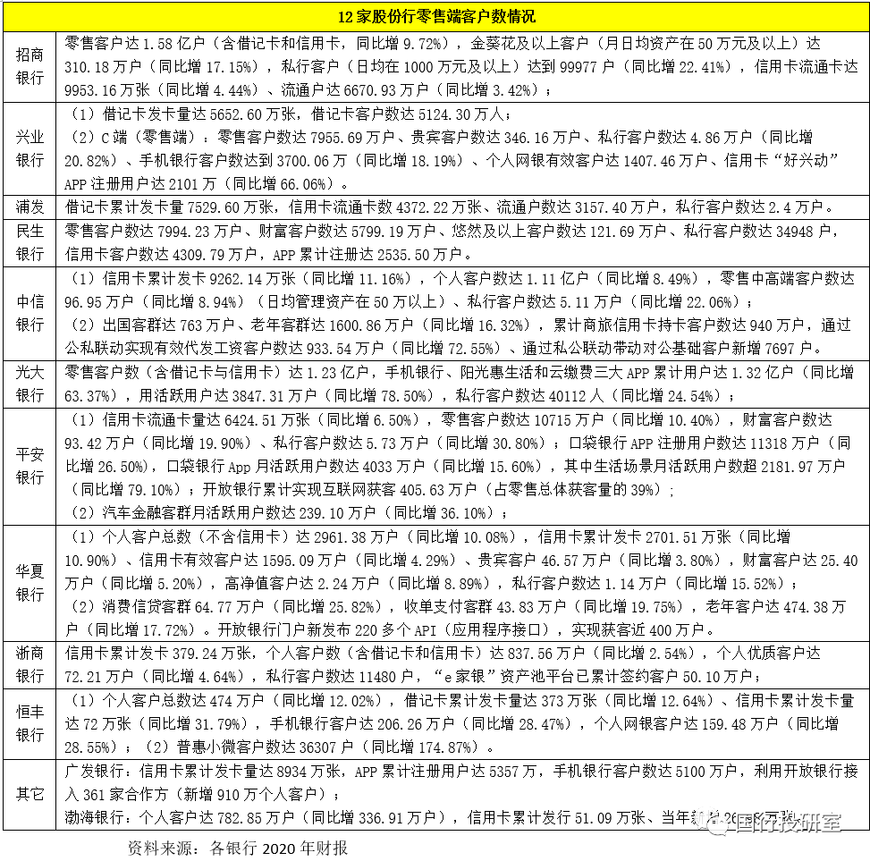 2、在關(guān)注借記卡和信用卡的卡量之外,目前多數(shù)股份行還會對零售客戶進(jìn)一步分類,如分為普通零售客戶數(shù)、財富客戶數(shù)、高凈值客戶數(shù)與私行客戶數(shù),同時對手機(jī)銀行客戶數(shù)、APP注冊用戶數(shù)與月活躍用戶數(shù)等指標(biāo)還特別重視。