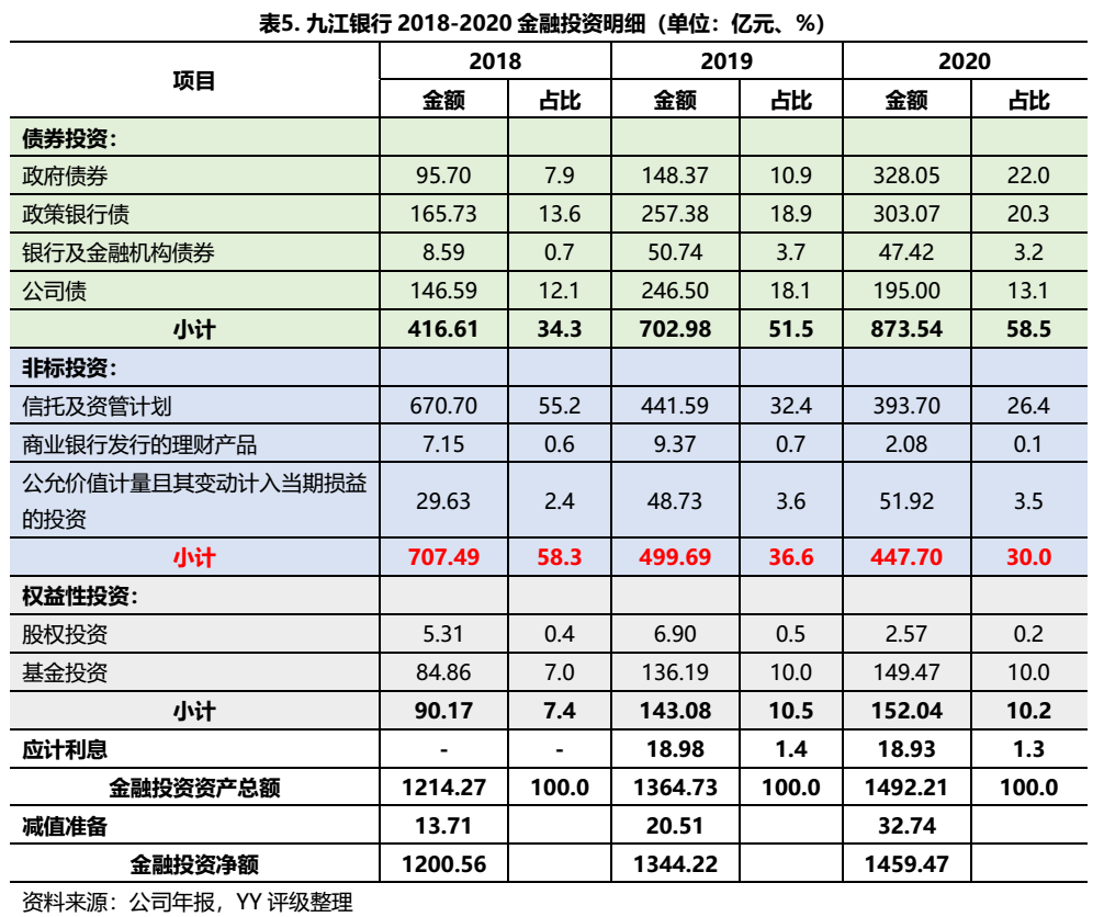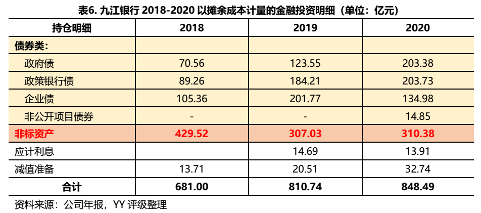 九江銀行近三年的非標資產規模已有較大幅度的壓降但絕對規模仍然較大,2020年金融投資計提了大額的減值損失,較大的可能是非標資產出現損失。