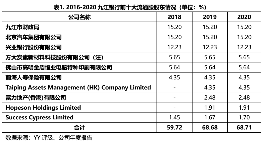 九江銀行最近3年前十大股東結構沒有發生較大的變化,股權結構比較穩定。其中九江市財政局通過九江財企金融服務有限公司間接持有九江銀行4000萬股,通過一致行動人九江市國有資產經營有限公司持有該行4345.48萬股,合計持有18.67%普通股股份,為九江銀行的最大股東。2020年末,前4大主要股東都沒有出質九江銀行的股份。
