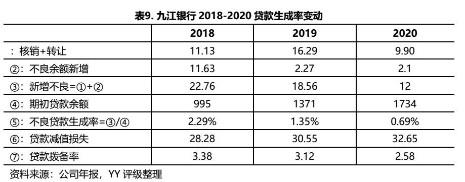 再從動態角度來分析九江銀行的貸款質量。2018-2020年,九江銀行貸款生成率有下降趨勢,綜合動態和靜態的不良率來看,九江銀行的貸款質量確實有轉好的趨勢。