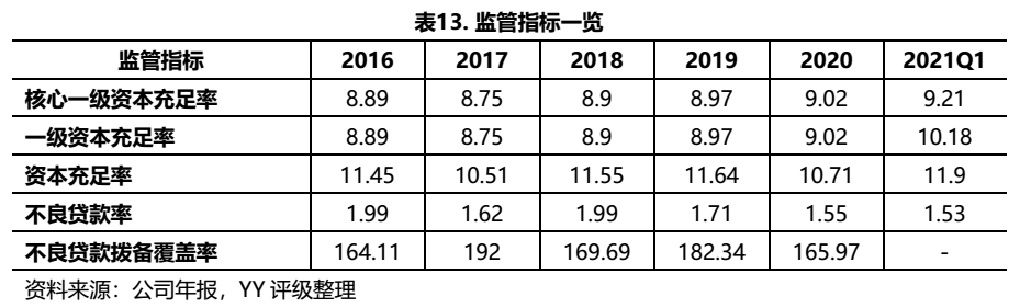 貸款撥備覆蓋率持續下降,可能原因是2018年銀監會下調了貸款撥備率的監管線,此外2018和2019也核銷了較多的不良貸款,這可能是2018-2019不良率下降較快的原因。但需要的關注的是,貸款撥備率已經接近2.5%的監管線(目前的監管要求貸款撥備率為1.5%~2.5%),2020年核銷減少可能是避免核銷過多而貸款撥備無法滿足監管要求。