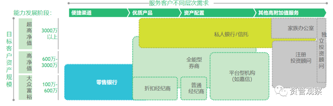 四是財富管理開放化。我國正值金融開放的大時代,未來境外財富管理機構(gòu)將加快布局步伐,國內(nèi)市場競爭會更加激烈,對于居民是更大的利好。不過現(xiàn)實情況看,結(jié)合境外財富管理機構(gòu)的優(yōu)勢,短期看,境外財富管理機構(gòu)更可能在超高凈值客戶等方面尋求突破,這也是國內(nèi)財富管理機構(gòu)的短板所在,未來可能逐步深入高凈值客戶。