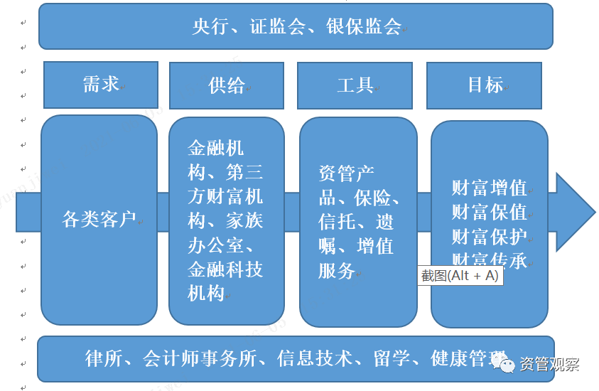 雖然在金融領域,有關財富管理和資產(chǎn)管理的話題很多,包括以財富管理為主題的各種論壇,但是現(xiàn)實中不同人對于財富管理有不同的理解,至少一個普遍的傾向是財富管理與資產(chǎn)管理經(jīng)常混淆,或者將二者等同。與資管業(yè)務的理解、監(jiān)管相比,財富管理是一個更加模糊的詞語和領域,但是其內(nèi)涵要遠大于資產(chǎn)管理這是毋庸置疑的。從根本上看,財富管理是滿足個人客戶的資產(chǎn)和負債管理需求,為其提供的投資、債務、保險、養(yǎng)老、遺產(chǎn)繼承、稅收籌劃等方面的金融產(chǎn)品和服務、解決方案以及非金融服務。由此可見,資產(chǎn)管理是財富管理的重要組成部分,但是卻不是其全部。從目標上來看,資產(chǎn)管理更多是實現(xiàn)客戶的資產(chǎn)保值增值,而財富管理更多致力于滿足不同生命周期的生活目標;資產(chǎn)管理更多是以銷售各類資管產(chǎn)品和服務為宗旨,而財富管理更多是以為客戶提供個性化綜合金融解決方案為宗旨。