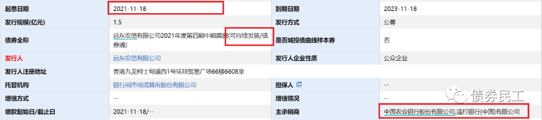 遠(yuǎn)東宏信有限公司2021年度第四期中期票據(jù)(可持續(xù)發(fā)展/債券通)于2021年11月18日正式起息,是國(guó)內(nèi)首單可持續(xù)發(fā)展債券!