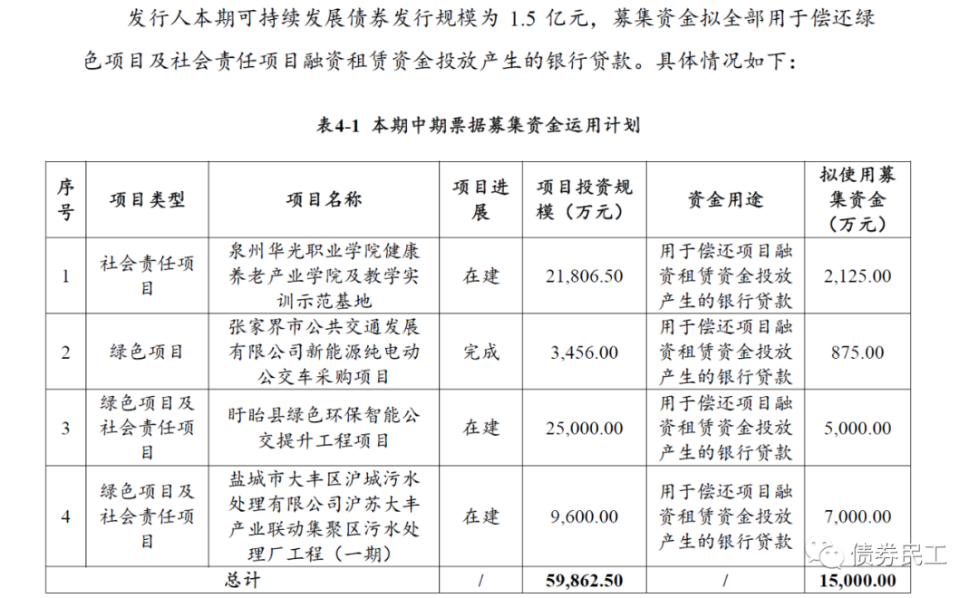 本期債券的發(fā)行規(guī)模為1.5億元,發(fā)行期限為2年。根據(jù)公開(kāi)披露的信息,本次債券的募集資金用途為償還綠色項(xiàng)目及社會(huì)責(zé)任項(xiàng)目融資租賃資金投放產(chǎn)生的銀行貸款,共涉及到4個(gè)項(xiàng)目,分別屬于社會(huì)責(zé)任項(xiàng)目和綠色項(xiàng)目路。與此同時(shí),募集說(shuō)明書(shū)同時(shí)披露了4個(gè)募投項(xiàng)目的經(jīng)濟(jì)效益、社會(huì)效益和環(huán)境效益。