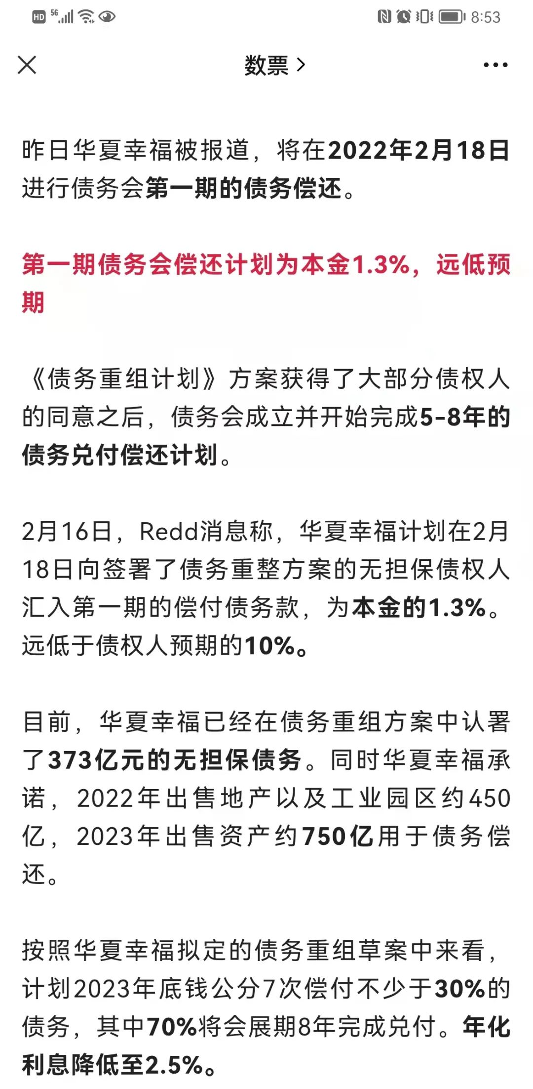 據(jù)悉,華夏幸福與中融信托就逾期信托計(jì)劃產(chǎn)品,談的是5年的一個(gè)計(jì)劃還款方案,最后將其改為8年時(shí)間。