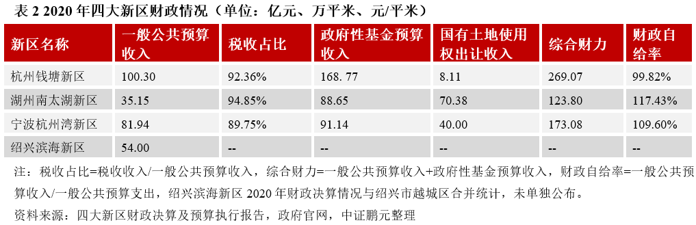 從可獲得數(shù)據(jù)來看,2020年杭州錢塘新區(qū)、寧波杭州灣新區(qū)一般公共預(yù)算收入規(guī)模較高,而紹興濱海新區(qū)(54.0億元)與湖州南太湖新區(qū)(31.5億元)整體收入規(guī)模偏?。毁|(zhì)量方面,杭州錢塘新區(qū)與杭州錢塘新區(qū)、湖州南太湖新區(qū)稅收占比均在90%左右,一般公共預(yù)算收入質(zhì)量較高。2020 年錢塘新區(qū)政府性基金預(yù)算收入規(guī)模較高,湖州南太湖新區(qū)國有土地使用權(quán)出讓收入占比為79.39%,土地財政依賴度較高。財政收支方面,杭州錢塘新區(qū)、寧波前灣新區(qū)與湖州南太湖新區(qū)2020年財政自給率分別為99.82%、109.60%和117.43%,收支平衡性較強。