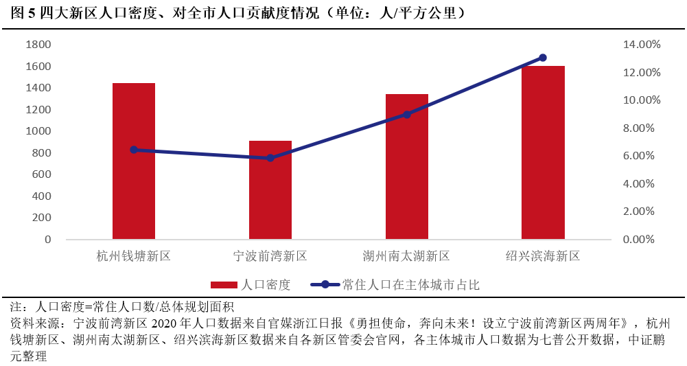 根據(jù)第七次全國人口普查數(shù)據(jù),杭州錢塘新區(qū)常住人口規(guī)模最高為76.9萬人,紹興濱海新區(qū)與寧波前灣新區(qū)常住人口分別達69.0萬人、55.0萬人,湖州南太湖新區(qū)常住人口規(guī)模最小為30.3萬人。人口密度來方面,紹興濱海新區(qū)人口密度最高為1,605人/平方公里,寧波前灣新區(qū)人口密度最低為911人/平方公里。從各大新區(qū)對全市人口貢獻度來看,杭州錢塘新區(qū)與寧波前灣新區(qū)常住人口在主體城市總?cè)丝谡急容^小,分別為6.44%與5.85%;紹興濱海新區(qū)與湖州南太湖新區(qū)人口吸附力相對較強,占比分別為13.09%、9.00%。四大新區(qū)人口資源稟賦存在差異,從區(qū)位角度分析,差異主要源于杭州錢塘新區(qū)的大江東產(chǎn)業(yè)集聚區(qū)與寧波前灣新區(qū)均距離主城區(qū)較遠,市區(qū)人口增長的外溢較弱,近年隨著地鐵、商業(yè)等基礎(chǔ)設(shè)施配套建設(shè)進度加快,大江東產(chǎn)業(yè)集聚區(qū)區(qū)位條件正逐步得到改善;而紹興濱海新區(qū)與湖州南太湖新區(qū)距離主城區(qū)較近,且部分區(qū)域本身即為發(fā)展成熟的城市中心片區(qū),例如紹興濱海新區(qū)的鏡湖新區(qū)區(qū)塊為紹興全市首位度最高的城市新中心,袍江經(jīng)濟技術(shù)開發(fā)區(qū)為紹興市北部城市副中心,具有一定的人口集聚優(yōu)勢。