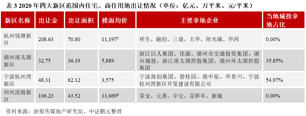 寧波前灣新區(qū)在四大新區(qū)中規(guī)劃面積最大為604平方公里,杭州錢塘新區(qū)與紹興濱海新區(qū)規(guī)劃面積分別為532平方公里、430平方公里,湖州南太湖新區(qū)在四大新區(qū)中規(guī)劃面積最小,僅為寧波前灣新區(qū)面積的37%。土地收入方面,杭州錢塘新區(qū)2020年住宅、商住用地出讓金最高,其次為紹興濱海新區(qū),且樓面均價超過10,000元/平米,土地價值較高;湖州南太湖新區(qū)、寧波杭州灣新區(qū)出讓金規(guī)模與樓面均價均較低,且當?shù)爻峭镀髽I(yè)拿地占比較高。