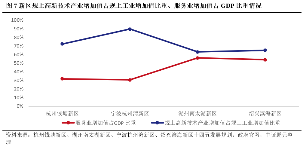 從可獲得數(shù)據(jù)來看,杭州錢塘新區(qū)2020年三產(chǎn)占比為1.3:66.8:31.9,寧波前灣新區(qū)2019年三產(chǎn)占比6.9:57.6:35.5,二產(chǎn)占比高于杭州市(2020年為25.9)、寧波市(2020年為45.9)與對標平臺(蘇州工業(yè)園區(qū)2020年為48.4)。從服務(wù)業(yè)增加值占GDP比重來看,湖州南太湖新區(qū)與紹興濱海新區(qū)占比較高,服務(wù)業(yè)發(fā)展水平較好,而杭州錢塘新區(qū)與寧波杭州灣新區(qū)分別為31.90%、30.80%,低于對標平臺(蘇州工業(yè)園區(qū)2020年為51.60%),現(xiàn)代服務(wù)業(yè)發(fā)展相對滯后,產(chǎn)業(yè)結(jié)構(gòu)調(diào)整有較大空間。從規(guī)上高新技術(shù)產(chǎn)業(yè)增加值占規(guī)上工業(yè)增加值比重看,杭州錢塘新區(qū)與寧波杭州灣新區(qū)高新技術(shù)產(chǎn)業(yè)占比較高,分別為72.54%和89.90%,工業(yè)基礎(chǔ)較好。