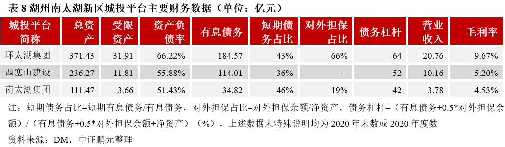 環(huán)太湖集團主要從事湖州經(jīng)濟技術(shù)開發(fā)區(qū)內(nèi)的土地開發(fā)整理和基礎(chǔ)設(shè)施、保障房建設(shè)業(yè)務(wù),收入主要來自貿(mào)易、土地開發(fā)整理、委托代建,其中貿(mào)易業(yè)務(wù)為2020年新增業(yè)務(wù);公司近年有息債務(wù)規(guī)模快速增長,整體債務(wù)負擔較重,且短期債務(wù)占比較高。西塞山建設(shè)業(yè)務(wù)范圍主要集中在南太湖新區(qū)內(nèi)西塞山分區(qū)、楊家埠分區(qū)北片、康山分區(qū)及塘口片區(qū),收入主要來自貿(mào)易和基礎(chǔ)設(shè)施代建業(yè)務(wù),代建業(yè)務(wù)在分區(qū)內(nèi)具有一定壟斷優(yōu)勢;公司資產(chǎn)結(jié)構(gòu)以其他應(yīng)收款和存貨為主,基礎(chǔ)設(shè)施代建與土地整理等政府回購項目資金到位較緩慢。南太湖集團主要承擔湖州太湖旅游度假區(qū)景區(qū)設(shè)施的開發(fā)建設(shè)和后期的運營管理任務(wù),收入主要來自銅制品商品銷售、旅游基礎(chǔ)設(shè)施代建和旅游服務(wù),其中銅制品銷售收入占比較高,毛利率水平較低為0.24%,旅游服務(wù)2020年受疫情影響較大,公司整體盈利能力不佳。