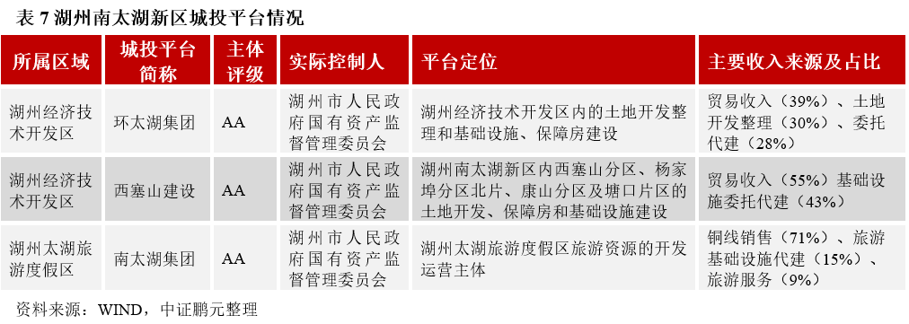 湖州南太湖新區(qū)主要擁有三個發(fā)債城投平臺,分別為浙江湖州環(huán)太湖集團有限公司(以下簡稱“環(huán)太湖集團”)、湖州西塞山開發(fā)建設(shè)有限公司(以下簡稱“西塞山建設(shè)”)和浙江南太湖控股集團有限公司有限公司(以下簡稱“南太湖集團”),均為主體評級AA平臺。