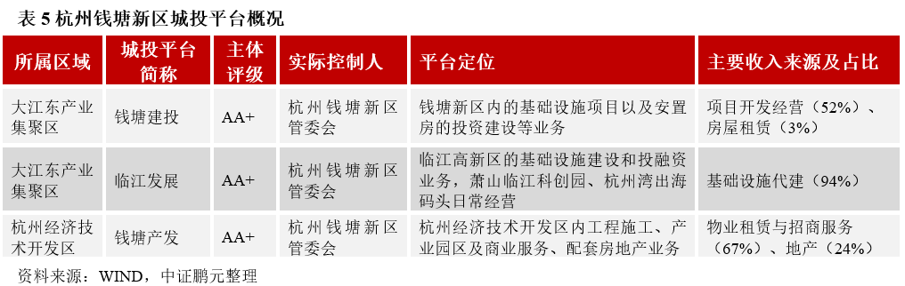 杭州錢塘新區(qū)主要擁有三個發(fā)債城投平臺,分別為杭州錢塘新區(qū)建設(shè)投資集團有限公司(以下簡稱“錢塘建投”)、杭州臨江投資發(fā)展有限公司(以下簡稱“臨江投資”)和杭州錢塘新區(qū)產(chǎn)業(yè)發(fā)展集團有限公司(以下簡稱“錢塘產(chǎn)發(fā)”),均為主體評級AA+平臺。