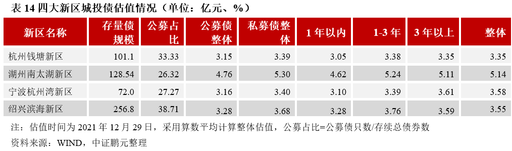 截至2021年12月29日,四大新區(qū)城投平臺存續(xù)債務(wù)余額合計為556.44億元,其中紹興濱海新區(qū)存量債規(guī)模最高為256.8億元,寧波杭州灣新區(qū)(72.0億元)與杭州錢塘新區(qū)(101.1億元)規(guī)模較小。四大新區(qū)合計共有73只存續(xù)城投債,其中公募債24只。估值方面,湖州南太湖新區(qū)是四大新區(qū)中唯一整體估值水平超過5%的區(qū)域;杭州錢塘新區(qū)、寧波杭州灣新區(qū)和紹興濱海新區(qū)平臺估值水平在3.5%左右,分別為3.35%、3.58%和3.55%。