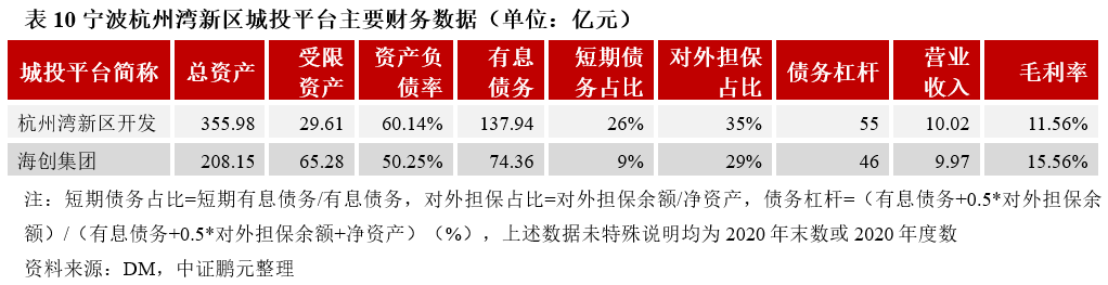 寧波杭州灣新區(qū)主要擁有兩個發(fā)債城投平臺,分別為寧波杭州灣新區(qū)開發(fā)建設(shè)有限公司(以下簡稱“杭州灣新區(qū)開發(fā)”)、寧波海創(chuàng)集團有限公司(以下簡稱“海創(chuàng)集團”),其中杭州灣新區(qū)開發(fā)為主體評級AA+平臺,海創(chuàng)集團為主體評級AA平臺。