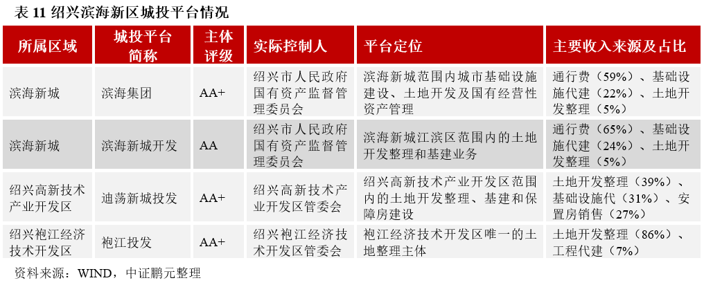 紹興濱海新區(qū)主要擁有四個發(fā)債城投平臺,分別為紹興濱海新區(qū)發(fā)展集團有限公司(以下簡稱“濱海集團”)、浙江濱海新區(qū)開發(fā)投資有限公司(以下簡稱“濱海新城開發(fā)”)、紹興高新技術(shù)產(chǎn)業(yè)開發(fā)區(qū)迪蕩新城投資發(fā)展有限公司(以下簡稱“迪蕩新城投發(fā)”)和紹興袍江工業(yè)區(qū)投資開發(fā)有限公司(以下簡稱“袍江投發(fā)”),其中濱海集團、迪蕩新城投發(fā)和袍江投發(fā)均為主體評級AA+平臺,濱海新城開發(fā)為主體評級AA平臺。