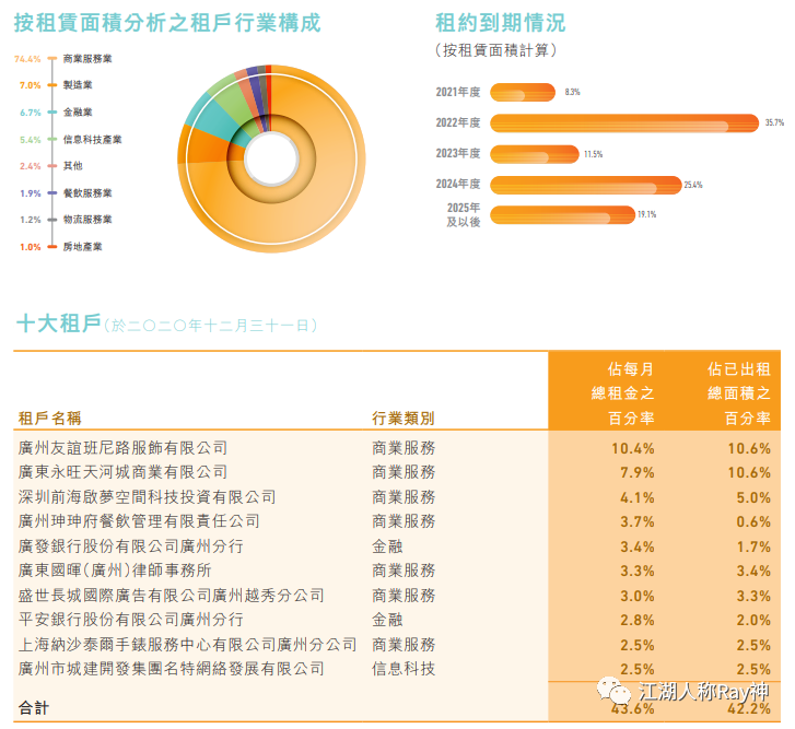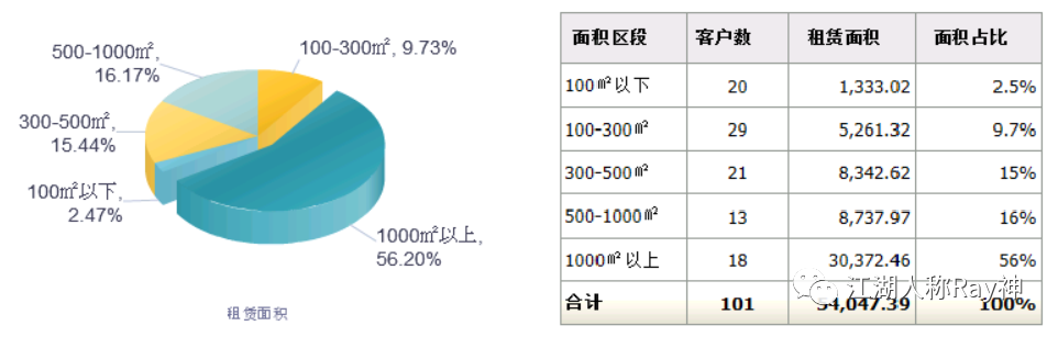 許多企業會統計不同行業或業態的客戶承租面積及占比,來分析影響自身項目穩定性的客群特征;REITs經常會按照承租面積來統計十大租戶,以識別哪些客戶對項目空間的影響程度大。
