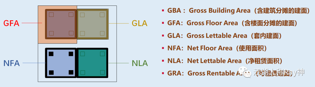在之前的文章中,我們提到過不動產的面積類型包括:建筑面積(GFA或GBA)、套內面積(GLA)、使用面積(NFA)等等。這幾種面積類型其實都是從空間的物理維度進行衡量的,即:空間在圖紙上或實體建筑上客觀存在著的面積。這幾種面積通常會體現在我們的產權證上,因此通常也可以認為是產權口徑的數據。一般我們進行面積測量,首先要搞清楚的就是這幾個口徑的面積。特別是,當項目沒有將產權切分到房間的時候,那業主方就更需要自己去理清楚它們之間的關系。